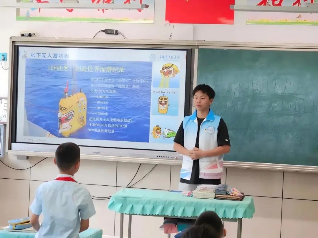 “10896米!哈工程‘ 悟空号’AUV再创潜深纪录!”在铁力市第一小学,至工书院的实践队员们以“悟空号”AUV的深潜纪录为引,为孩子们带来了一堂生动的科普教育课,在他们心中播下了向海图强、立志报国的种子。