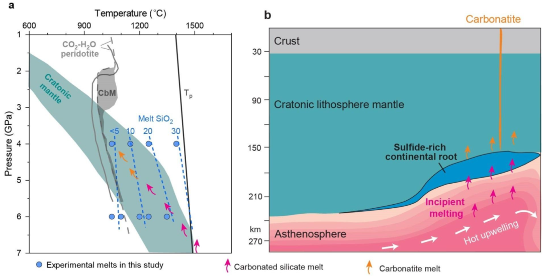 起源于克拉通之下、深部地幔的初始岩浆,富含碳酸盐成分,向上迁移时会横向流动至边缘区域,从而导致岩石圈厚度相对较小的边缘地区火山活动频繁。该论文通过高温高压实验模拟了这种边缘岩浆的演化过程,发现当富含碳酸盐岩浆从克拉通下方向上迁移时,其中的硅酸盐成分发生沉淀,导致岩浆中的硅逐渐被去除,最终转变为几乎纯的碳酸盐岩浆,即火成碳酸岩。当岩浆中的硅酸盐发生沉淀时,其中蕴含的金属和硫元素也以硫化物的形式从岩浆中沉淀出来,最终在克拉通边缘形成金属和硫的异常富集带,即具有硫化物富集特征的大陆根。