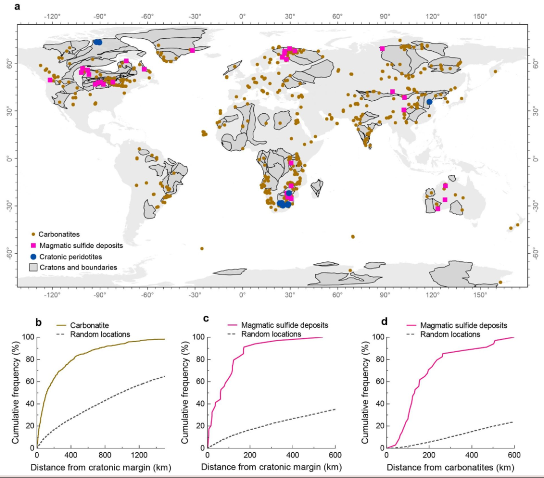 ▲全球碳酸岩、硫化物矿床和克拉通分布特征