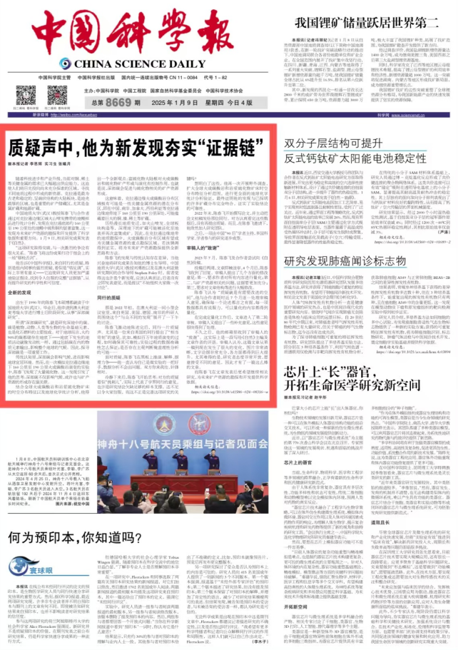 《中国科学报》1月9日的头版头条,深度报道了我校陈春飞教授的这项科研成果,全文如下: