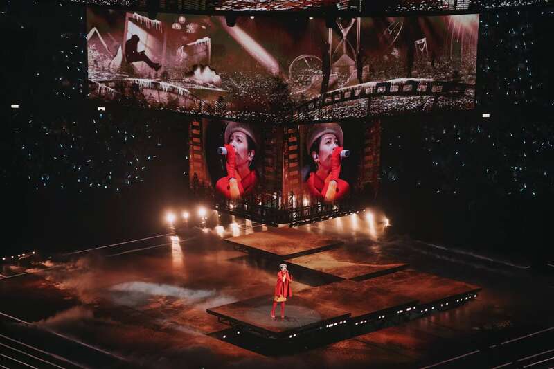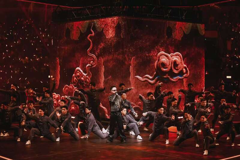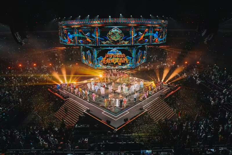 晚会现场,舞美设计以层峦叠嶂为形,象征山水相连,寓意吉祥与团圆,彰显东方文化的独特韵味。中国风元素与现代科技灯光相互辉映,表达现代与传统相融的美感,契合中华文化中天地交融、万物和谐的审美追求,烘托出大气磅礴的演出意境。