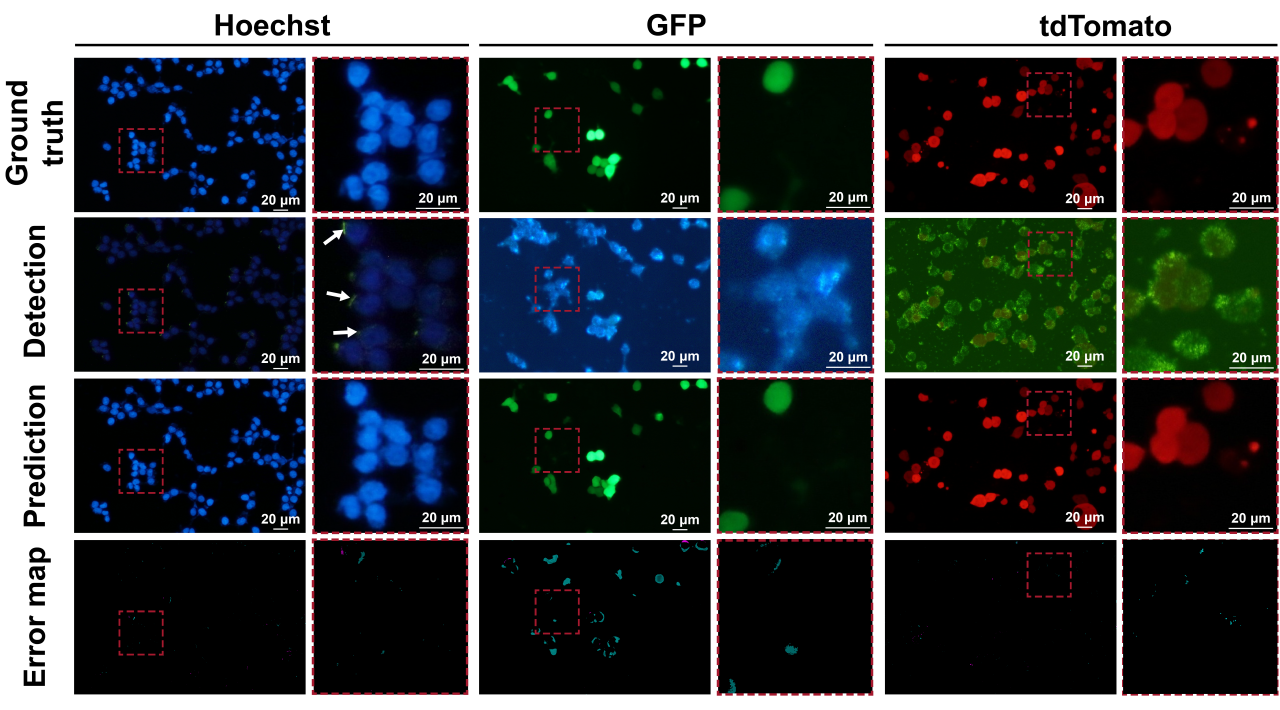团队从AI技术出发,开发了“数字虚拟滤波器(digital optical filter)”,提出了无滤波荧光显微成像技术。使用该技术的荧光显微成像系统,可完全摒弃昂贵的荧光滤波元件,通过暗场照明方式,减弱背景噪声。成像系统获取图像后,通过神经网络,自动选择荧光通道,准确预测荧光信号。结果表明,无滤波荧光显微成像系统具有良好的鲁棒性,对不同显微放大倍率、荧光染料浓度、样品种类,均能高效、精准地还原出荧光信号,实现高灵敏、高特异性荧光成像。