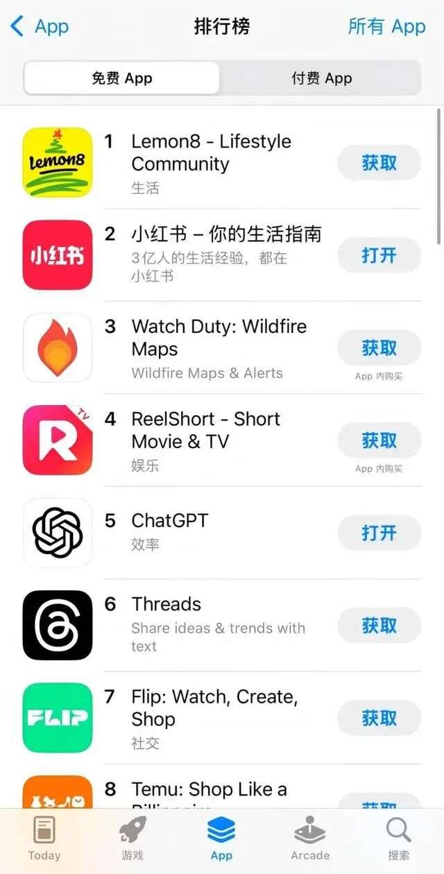 小红书登上美国App Store社交榜第1名、免费总榜第2名。图片来源:蓝鲸财经