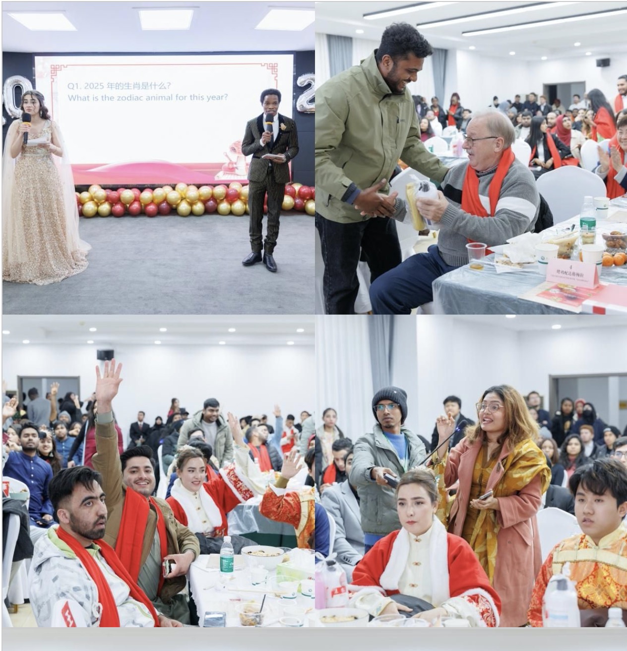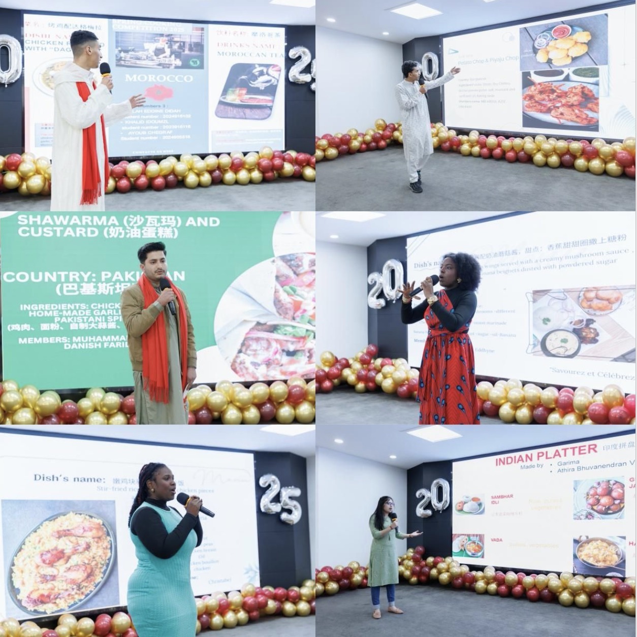 团拜会现场,孟加拉国、印度、巴基斯坦、尼泊尔、摩洛哥、加蓬等10余个国家学生呈现了亲手制作的20 余道本国特色菜品,嘉宾和观众现场品尝。色彩斑斓、香气四溢的美食摆满餐桌,全体师生穿梭其间,品尝各类佳肴。欢声笑语交织,大家以舌尖为纽带,跨越国界,共享多元文化交融的欢乐,温暖情谊在美味中升温。