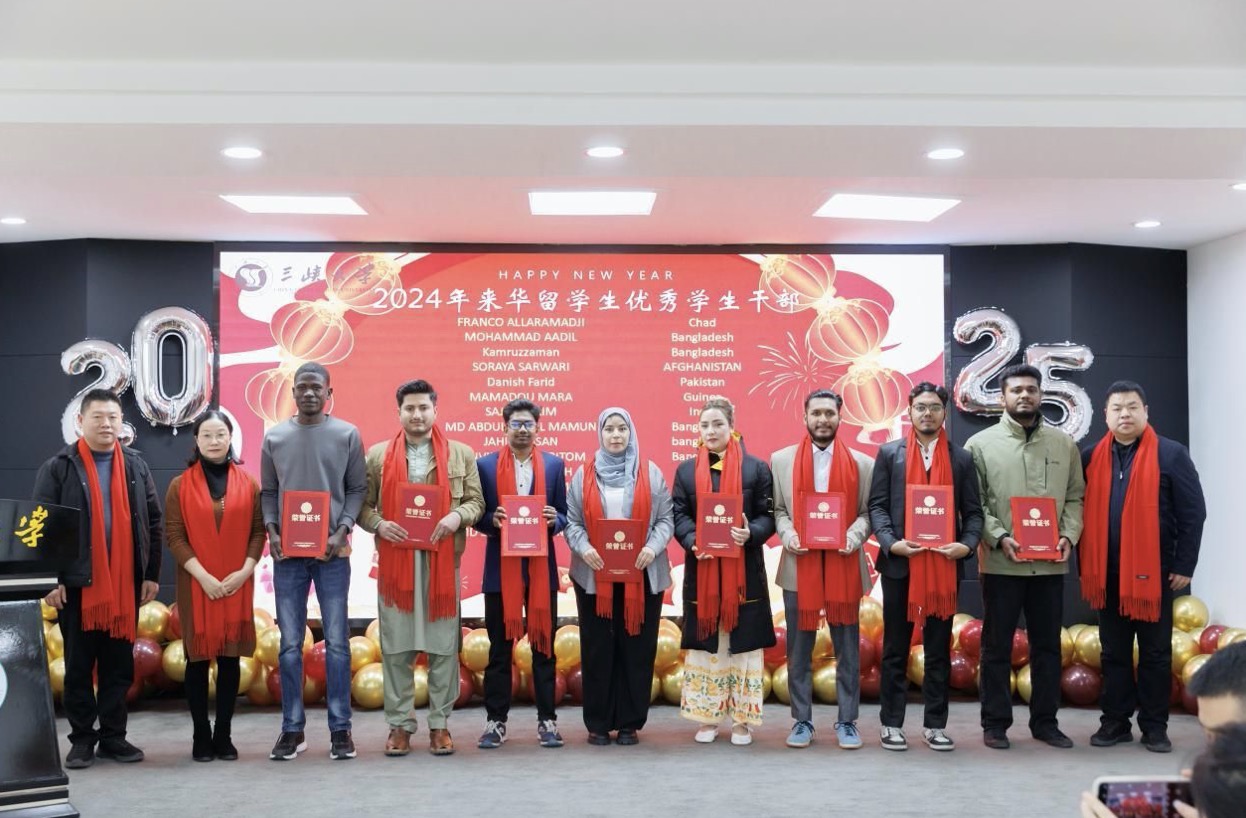 活动现场颁发“公寓楼层长”聘书,表彰2024年来华留学生文明寝室、优秀学生干部。