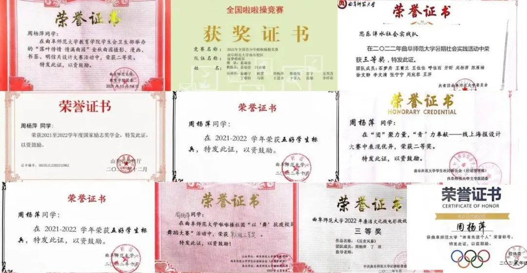 在校期间曾获2022年全国青少年啦啦操精英赛公开青年丙组-集体花球自选动作第八名、国家励志奖学金(2022、2023)、弘毅奖学金、曲阜师范大学“五好学生”、曲阜师范大学“优秀团员”、曲阜师范大学“体育先进个人”荣誉称号等奖项。