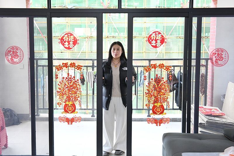 2025年1月21日,湖南省资兴市规模最大、安置人口最多的集中安置点福兴苑鞭炮齐鸣,受灾民众陆续搬进新家迎接新年。2024年7月底,湖南省资兴市遭遇极端强降雨天气,引发特大暴雨灾害,12.8万人受灾。图为村民刘雪娜打开贴有新年窗花的玻璃门。
