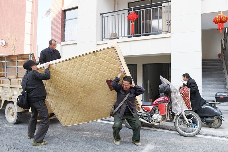 2025年1月21日,湖南省资兴市规模最大、安置人口最多的集中安置点福兴苑鞭炮齐鸣,受灾民众陆续搬进新家迎接新年。2024年7月底,湖南省资兴市遭遇极端强降雨天气,引发特大暴雨灾害,12.8万人受灾。图为村民搬床垫入户。