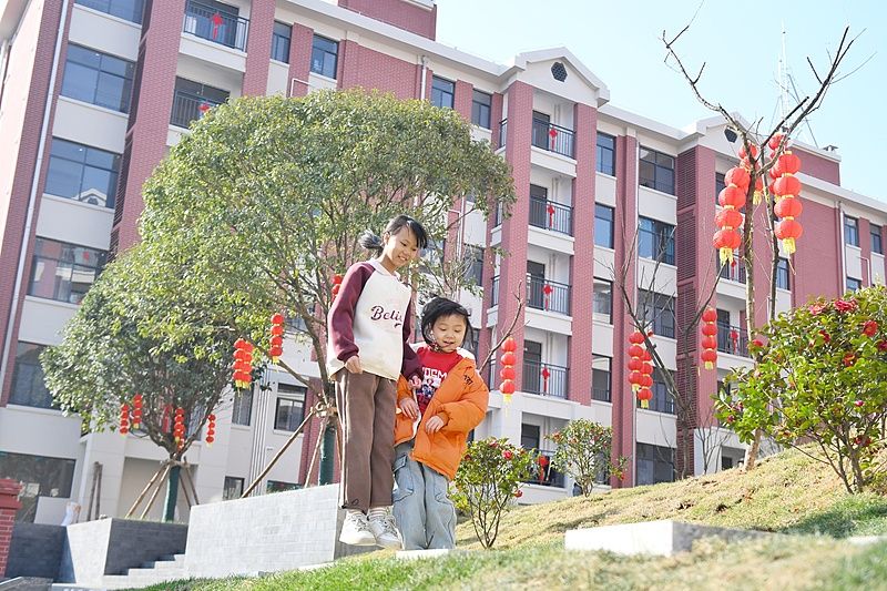 2025年1月21日,湖南省资兴市规模最大、安置人口最多的集中安置点福兴苑鞭炮齐鸣,受灾民众陆续搬进新家迎接新年。2024年7月底,湖南省资兴市遭遇极端强降雨天气,引发特大暴雨灾害,12.8万人受灾。图为孩子们在新房楼下玩耍。
