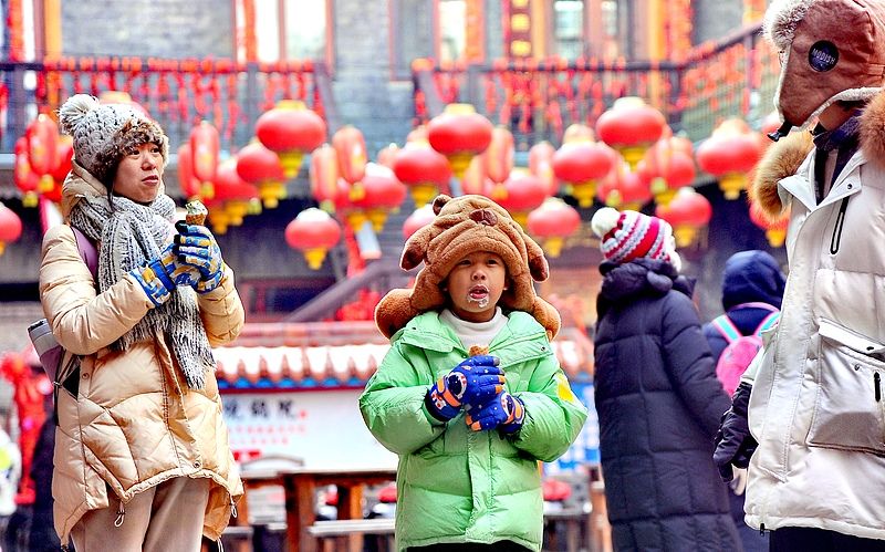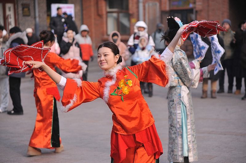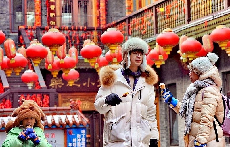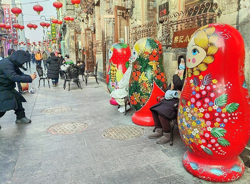 2025年1月21日,哈尔滨市道外区的中华巴洛克历史文化街区内,许多游客在观光游玩,品尝美食。佳节临近,街区里新增了许多红灯、花灯,年味渐浓。