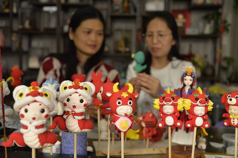 2025年1月21日,在河北省保定市望都县东关村林静面塑艺术工作室,手艺人们在制作面塑作品。