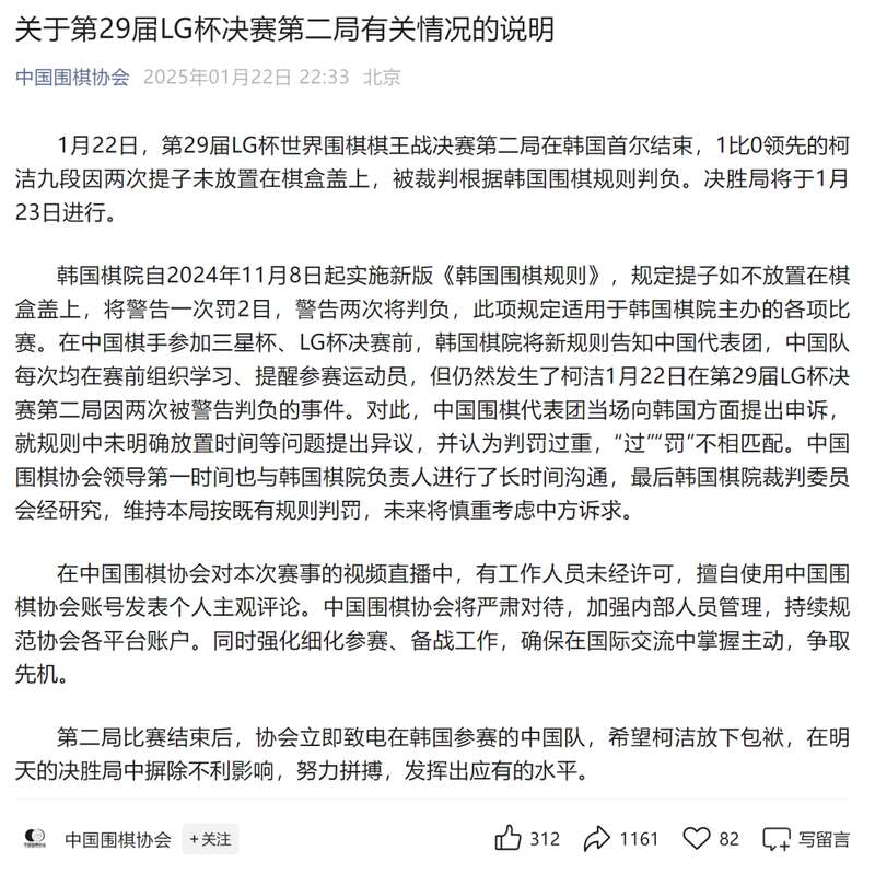昨晚,中国围棋协会发布《关于第29届LG杯决赛第二局有关情况的说明》称,中国围棋代表团当场向韩国方面提出申诉,就规则中未明确放置时间等问题提出异议,并认为判罚过重,“过”“罚”不相匹配。中国围棋协会领导第一时间也与韩国棋院负责人进行了长时间沟通,最后韩国棋院裁判委员会经研究,维持本局按既有规则判罚,未来将慎重考虑中方诉求。