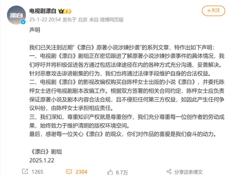 针对“《漂白》原著小说涉嫌抄袭”的系列文章,昨晚《漂白》剧组发布《声明》称:“电视剧《漂白》剧组正在密切跟进了解原著小说涉嫌抄袭事件的具体情况,我们呼吁并将积极促进各方通过包括法律途径在内的各种方式充分沟通、妥善解决。针对恶意攻击诽谤剧集的行为,我们也将通过法律手段维护自身的合法权益。”