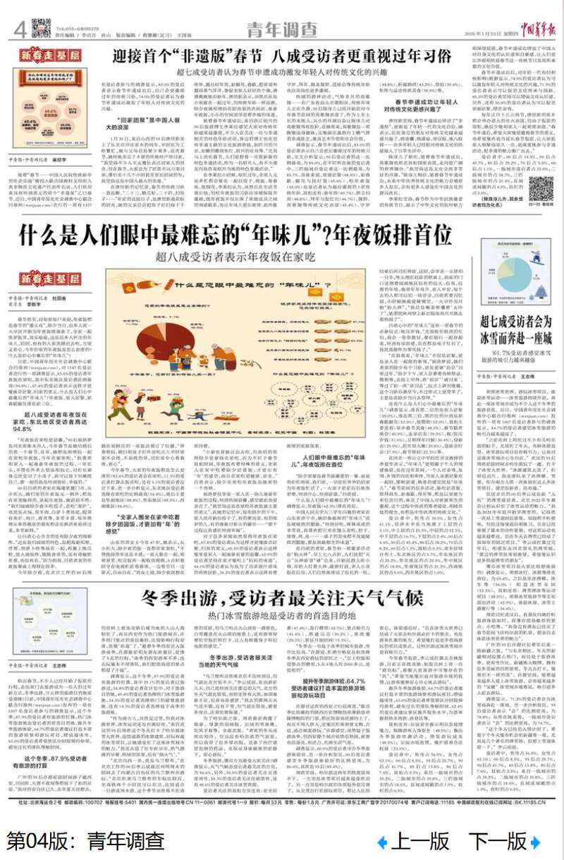 据中国青年报今日4版,日前,中国青年报社社会调查中心联合问卷网(wenjuan.com),对1347名受访者进行的一项调查显示,83.6%的受访者年夜饭在家吃,其中东北地区受访者比例最高(94.8%)。67.4%的受访者表示这样才更能体会团聚、归家的意义。