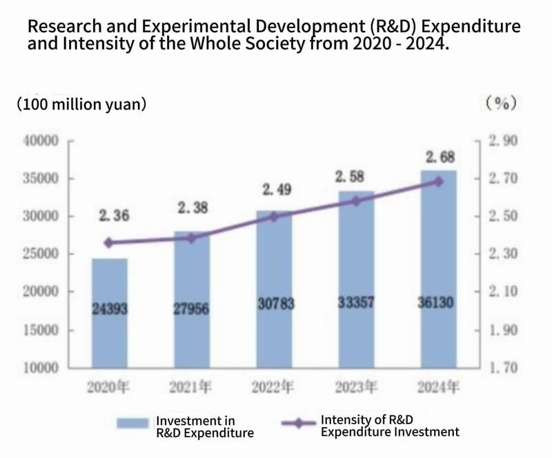 According to the National Bureau of Statistics, China's R&D spending in 2024 was 3,613 billion yuan, up 8.3% year-on-year. The intensity of R&D investment reached 2.68%, 0.10 percentage points higher than the previous year. Basic research funds were 249.7 billion yuan, an increase of 10.5%, accounting for 6.91% of R&D funds.