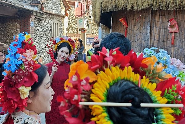 2025年1月30日,福建泉州,游客头戴“簪花围”在蟳埔村游览、拍照。春节假期,福建泉州蟳埔村旅游持续火爆,各地游客纷至沓来,感受“簪花围”魅力。 中新社记者 吕明 摄