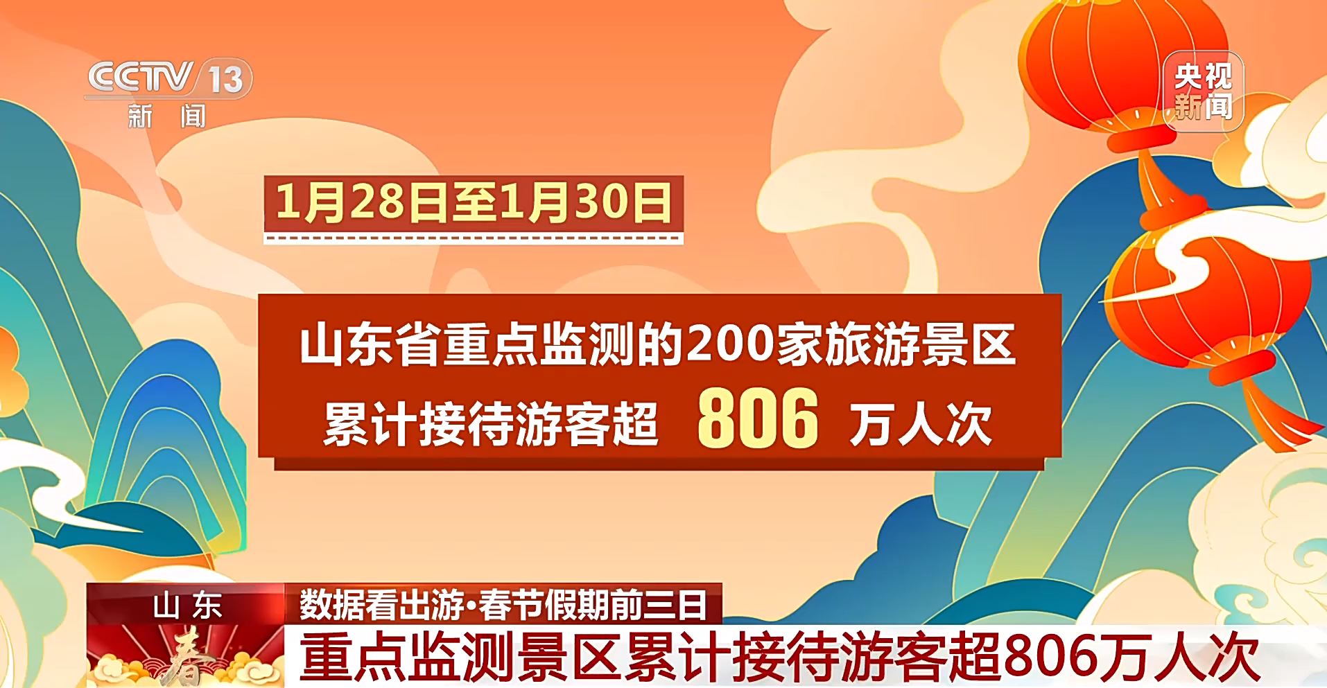 从除夕到大年初二的春节假期前三天,山东省重点监测的200家旅游景区,累计接待游客超806万人次。累计接待游客较多的景区分别是济南天下第一泉、烟台的烟台山、枣庄台儿庄古城、青岛海滨风景区以及潍坊青州古城。
