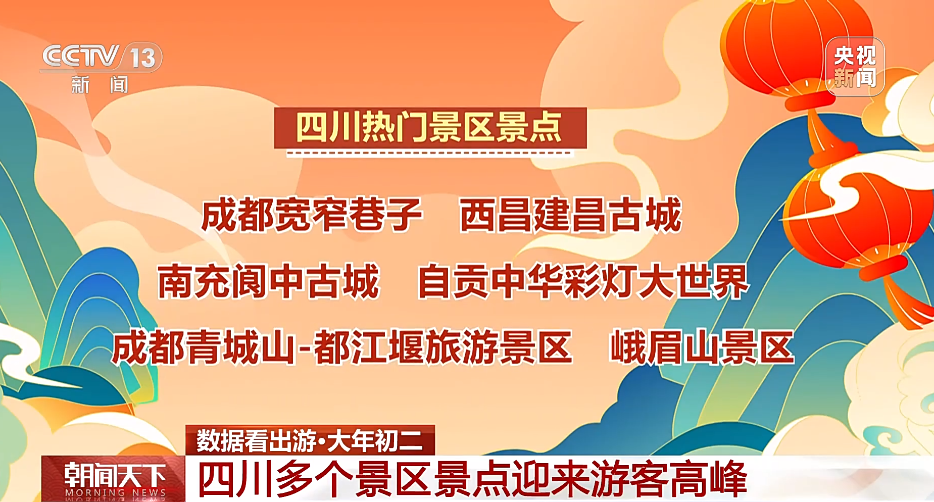 大年初二,群众出游意愿强烈,四川的多个景区景点迎来游客高峰。成都宽窄巷子、西昌建昌古城、南充阆中古城游客人数位居前列。还有不少游客选择去了自贡中华彩灯大世界、成都青城山-都江堰旅游景区以及峨眉山景区。