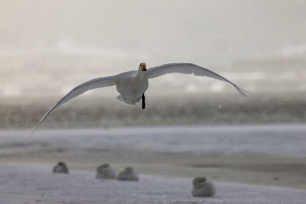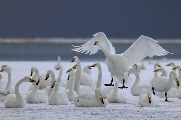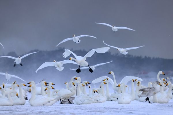 2025年2月7日,山东威海,荣成市天鹅湖银装素裹,成群的天鹅在生态唯美的湖滨沐雪起舞,引吭高歌。