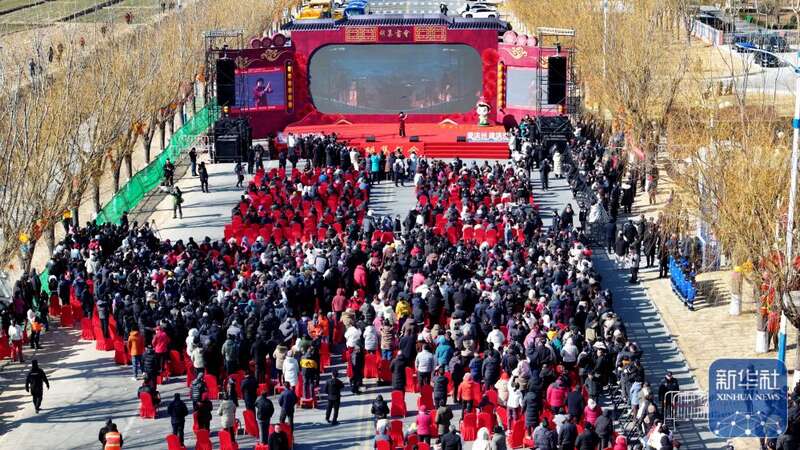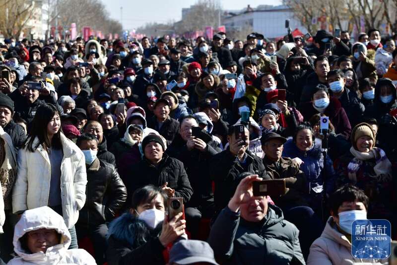 ↑2月9日,观众在观看中国曲协“送欢笑到基层”走进惠民专场演出(无人机照片)。