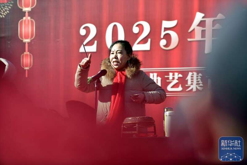 ↑2月9日,河北省保定市的曲艺艺人李志华在胡集书会上表演西河大鼓《罗成托梦》。