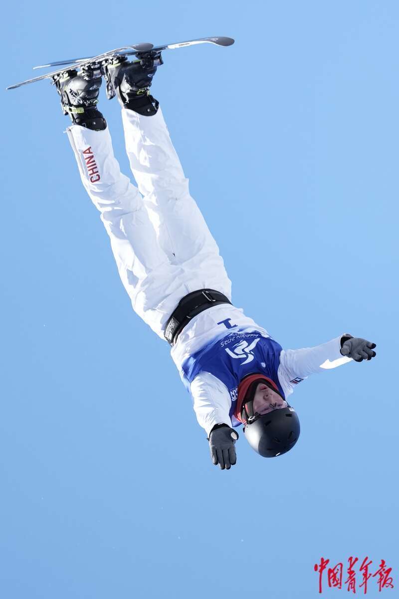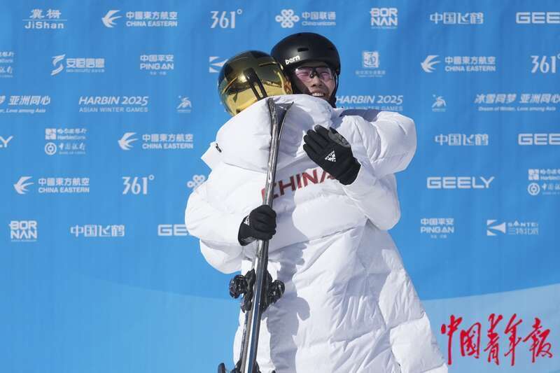 Chinese 19-year-old Li Xinpeng claimed gold in men's freestyle skiing aerials at the Asian Winter Games in Yabuli, Heilongjiang, scoring 123.45 points. Teammates Yang Longxiao and veteran Olympian Qi Guangpu secured silver and bronze, marking China's first podium sweep in the event. Li's triumph highlights the nation's rising dominance in winter sports. (Photo/Li Junhui)