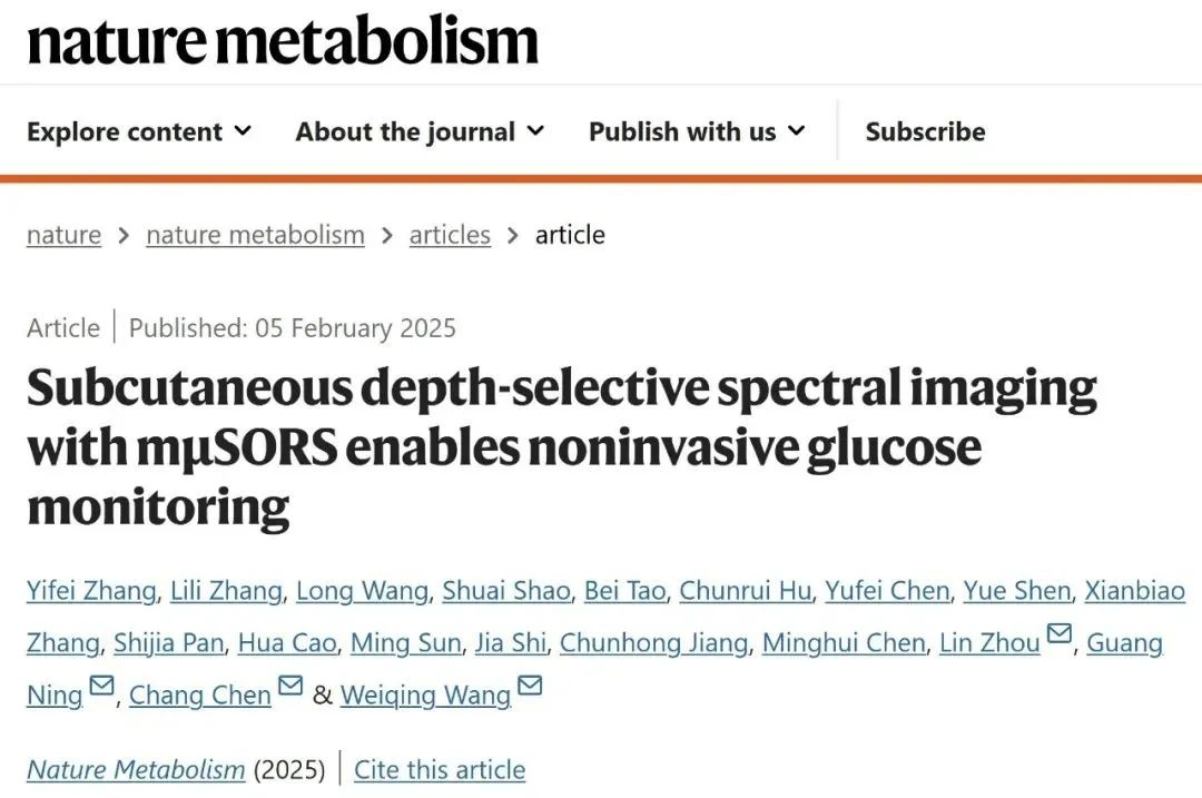 2025年2月5日,上海交通大学医学院附属瑞金医院国家内分泌代谢病临床研究中心王卫庆教授团队与瑞金医院医学芯片研究所及上海近观科技的陈昌研究员团队合作在《自然代谢》(Nature Metabolism)在线发表题为:“Subcutaneous depth-selective spectral imaging with mμSORS enables non-invasive glucose monitoring”的研究论文,为糖尿病患者带来告别扎手指或抽血测血糖等方法的福音。