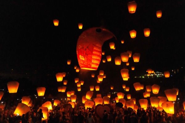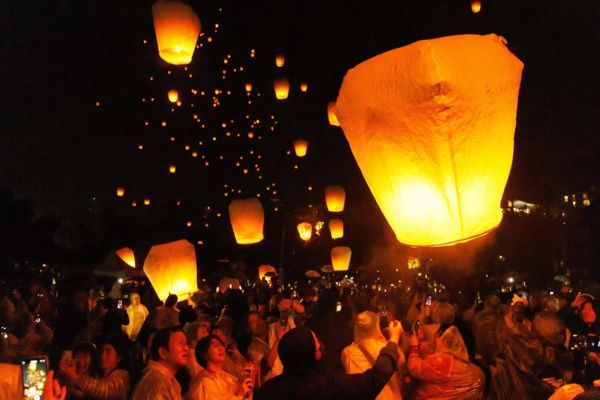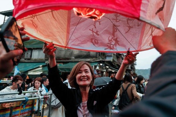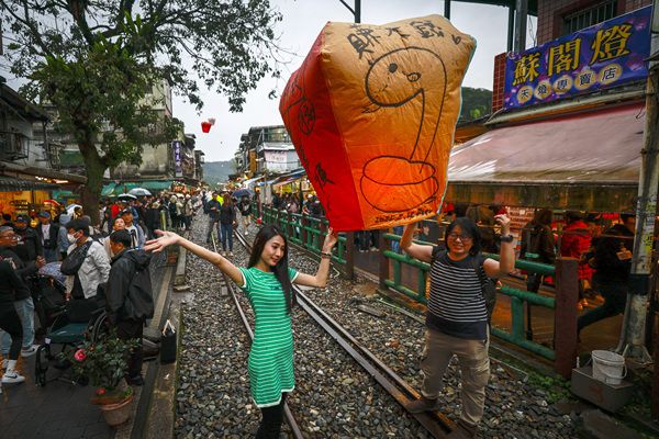 2025年2月12日,台湾省新北市平溪区,游客在平溪天灯节庆祝活动中放飞天灯,成千上万的天灯被放飞到空中,寄托着对和平与幸福的美好祝愿。