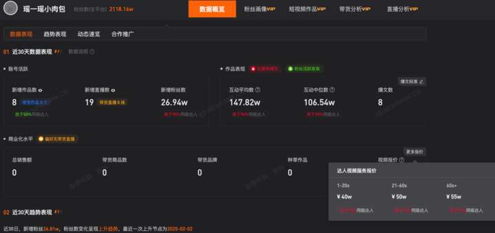 据悉,瑶一瑶的走红源于父母分享的日常视频,在“瑶一瑶小肉包”视频账号里,记录了她的很多日常生活场景,凭借其可爱、喜庆的特质,粉丝超过了2100万。该账号有着相当强的吸金能力,账号橱窗中有近30种商品,销售量可观。据第三方数据显示,“瑶一瑶小肉包”短视频账号广告报价为1-20秒视频40万元,21-60秒视频50万元,60秒以上视频55万元。其1月共计发布7条视频,其中话题标签直接带有品牌广告露出的达2条,时长均超2分钟,据此估计其1月广告收入已超百万。
