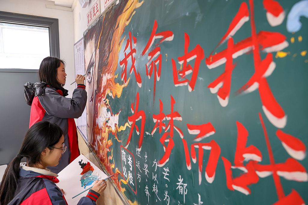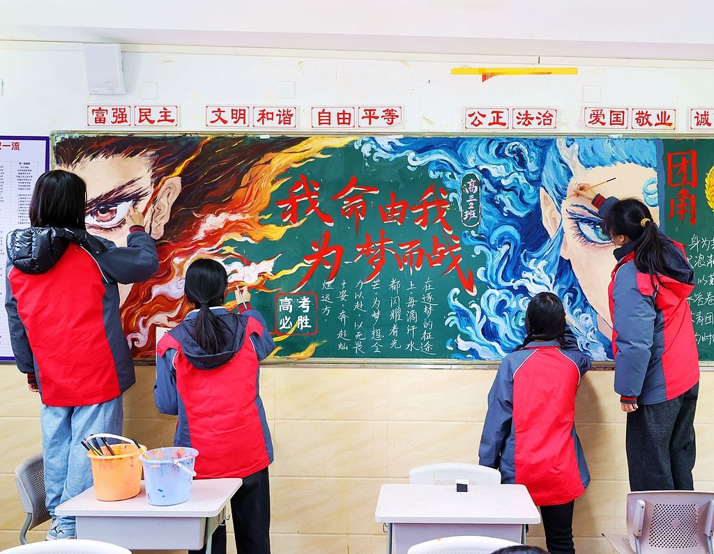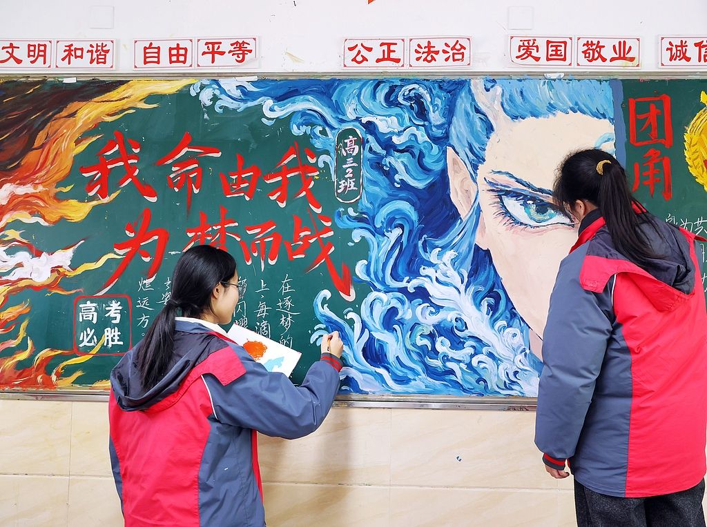 江苏无锡:燃高考斗志 高三学子手绘“哪吒”黑板报