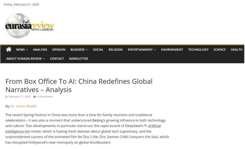 国际在线专稿:美国《欧亚评论》网站近日刊发学者伊姆兰·哈立德署名文章《从电影票房到人工智能:中国重新定义全球叙事》。文章聚焦近期火爆出圈的两大“中国智造”——国产AI大模型DeepSeek和国产动画影片《哪吒之魔童闹海》,指出中国在尖端科技与文化领域国际影响力显著增强,并对中国扎根传统、拥抱创新的发展理念给予高度评价。