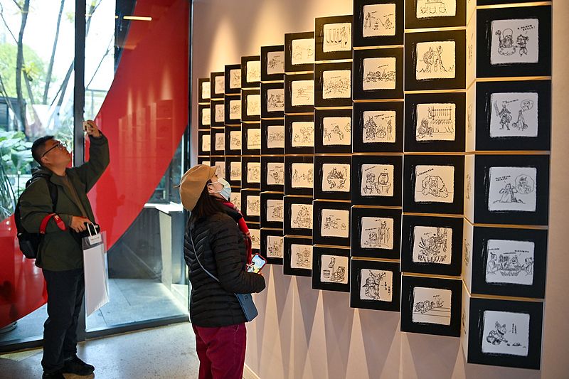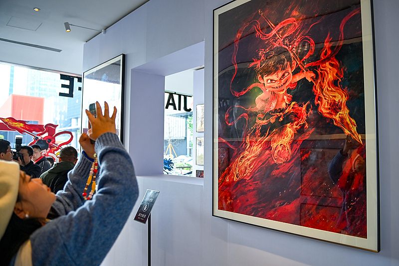 2025年3月3日,四川成都,展出的创作美术稿吸引参观者拍照。当日,“不破不立”——电影《哪吒之魔童闹海》幕后创作展在四川省成都市开展。本次展览是电影《哪吒之魔童闹海》幕后创作历程的全球首次集中展示,主要聚焦电影中重要角色的手稿及多个高燃名场面背后的创作点滴,让观众从角色、氛围、场景、概念等方面全方位认识浩如烟海的角色设定迭代历程。 中新社记者 刘忠俊 摄