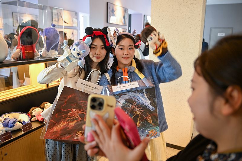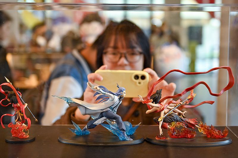2025年3月3日,四川成都,电影中的人物造型摆件吸引参观者拍照。当日,“不破不立”——电影《哪吒之魔童闹海》幕后创作展在四川省成都市开展。本次展览是电影《哪吒之魔童闹海》幕后创作历程的全球首次集中展示,主要聚焦电影中重要角色的手稿及多个高燃名场面背后的创作点滴,让观众从角色、氛围、场景、概念等方面全方位认识浩如烟海的角色设定迭代历程。 中新社记者 刘忠俊 摄