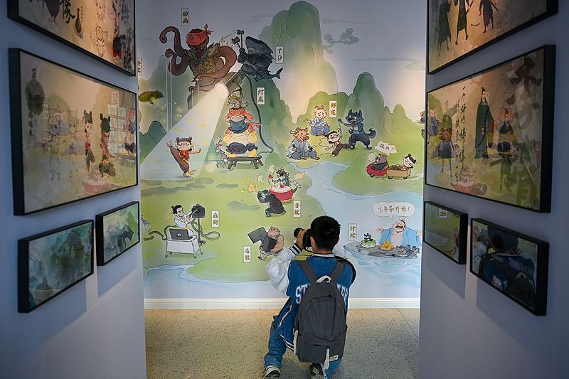 2025年3月3日,四川成都,参观者用手机拍摄。当日,“不破不立”——电影《哪吒之魔童闹海》幕后创作展在四川省成都市开展。本次展览是电影《哪吒之魔童闹海》幕后创作历程的全球首次集中展示,主要聚焦电影中重要角色的手稿及多个高燃名场面背后的创作点滴,让观众从角色、氛围、场景、概念等方面全方位认识浩如烟海的角色设定迭代历程。 中新社记者 刘忠俊 摄
