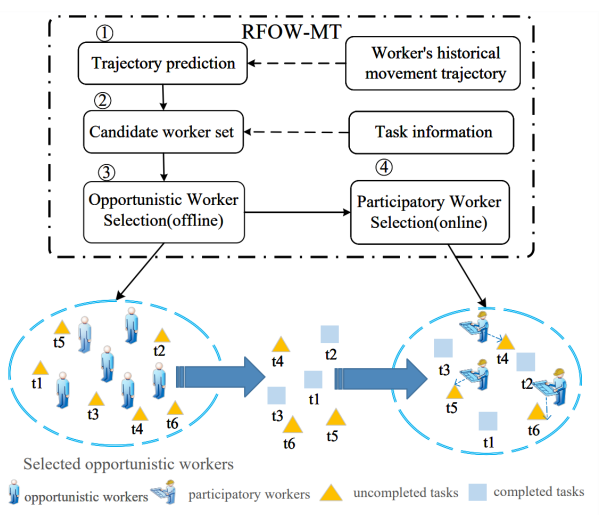 因此,该研究团队创新性地提出了一种基于轨迹预测确定候选众包工人集合的招募框架“RFOW- MT”,采用离线-在线结合的两阶段任务分配机制,从而有效解决上述问题。此外,该研究在智慧城市和环境监测领域具有重要应用价值,通过轨迹预测与动态优化,提高数据采集的效率、准确性和经济性。
