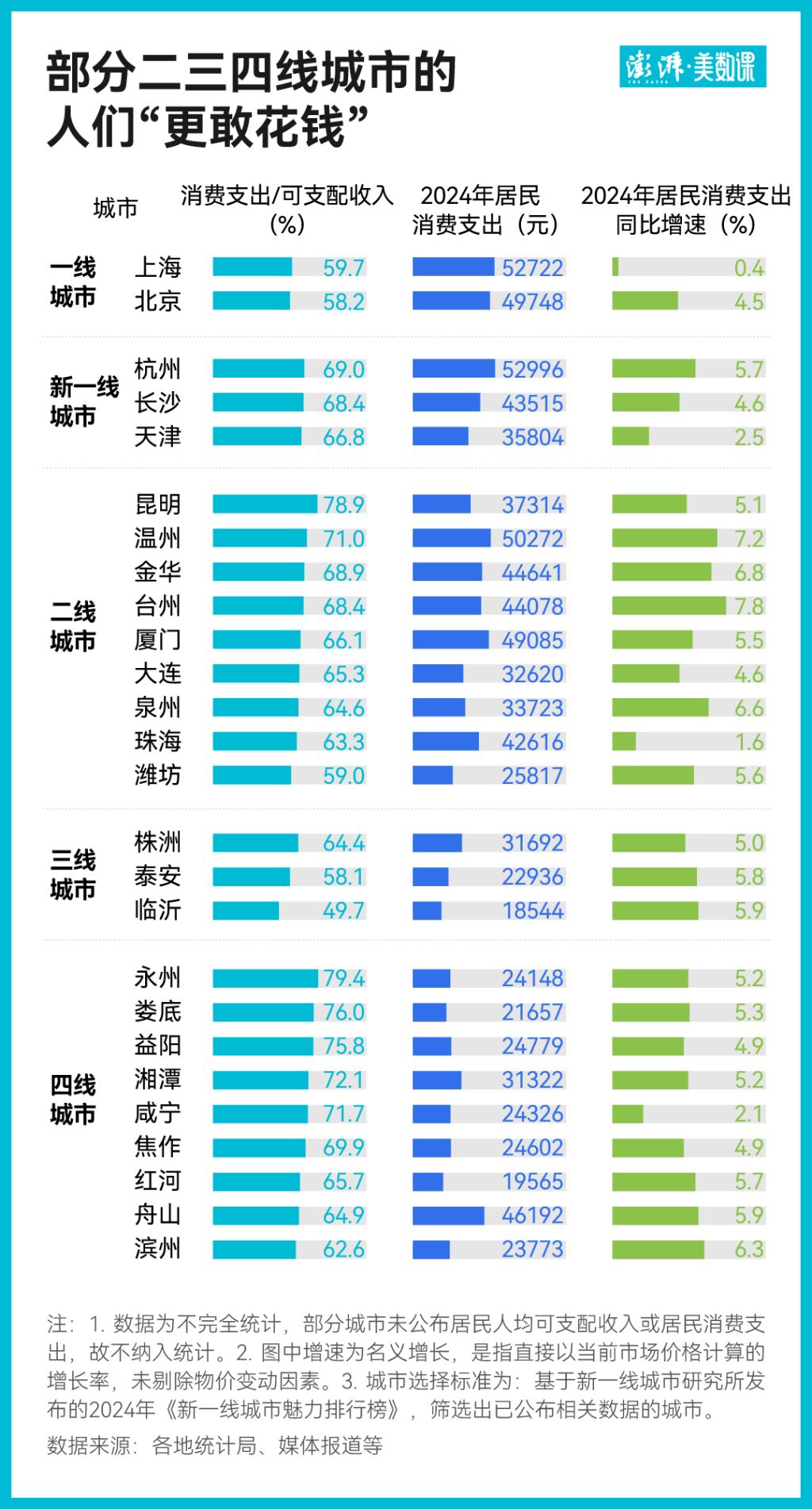 我们收集了全国26个已公布居民人均消费支出和人均可支配收入的城市,发现相比一线城市,部分二三线城市的居民消费倾向更强。比如,据温州市统计局,2024年温州的发展型享受型支出增长较快,教育文化娱乐支出比上年增长11%。