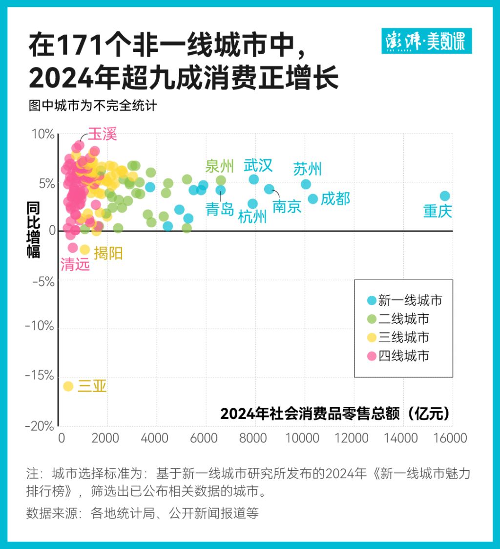 分城市来看,我们搜集了全国171个公布了2024年社零数据的非一线城市。在这些城市里,有97.1%的社零同比增幅为正增长,三线和四线城市的消费数据亮眼,比如四线城市云南玉溪的社零同比增长率是最高的,达到8.8%。