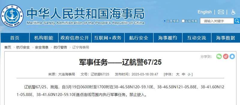 据中华人民共和国海事局、大连海事局,辽航警67/25,渤海,自3月19日0600时至1700时在38-46.58N120-59.10E、38-46.58N121-05.88E、38-41.60N121-05.88E、38-41.60N120-59.10E诸点连线范围内执行军事任务。禁止驶入。