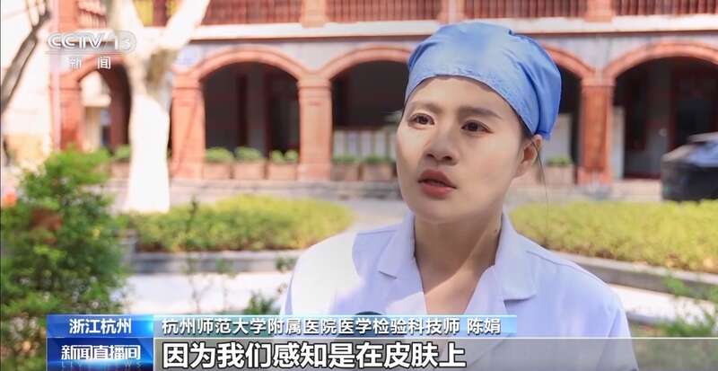 杭州师范大学附属医院医学检验科技师 陈娟:因为我们感知是在皮肤上,主要是皮肤神经去感知,通过快速(飞针采血)之后,在他没有来得及给神经反应(触发神经痛觉信号传导)的时候就结束了,这样相当于没有感觉或者减少疼痛感。