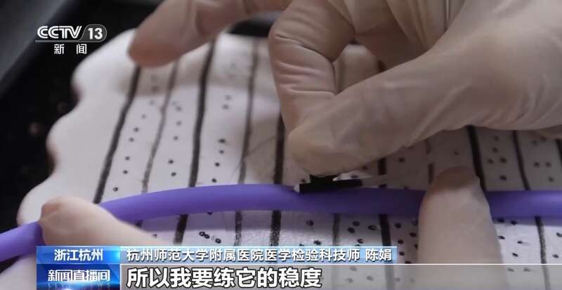 杭州师范大学附属医院医学检验科技师 陈娟:等你练出针的感觉好了之后,然后再开始练粗的线,练完之后再换细的线,细的线练好再去换这个点。