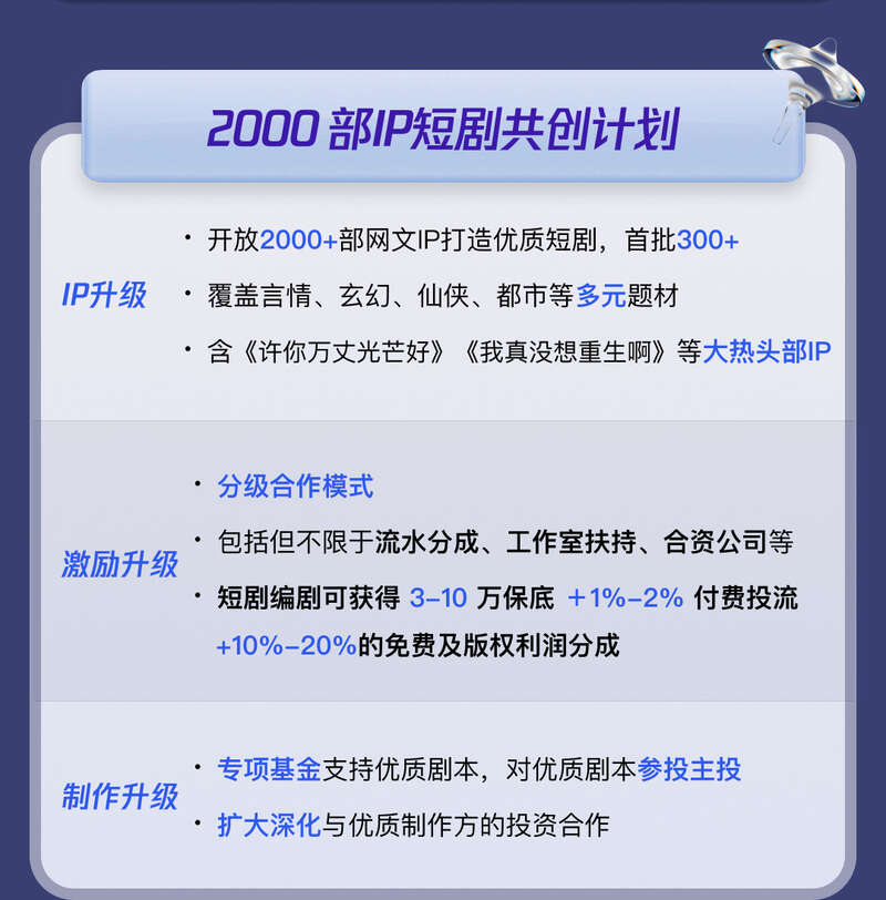 此次对外开放合作的网文IP覆盖言情、玄幻、仙侠、都市等题材,其中包括《许你万丈光芒好》《我真没想重生啊》等头部IP。另外,阅文短剧将成立专项基金,对优质剧本加大投入。