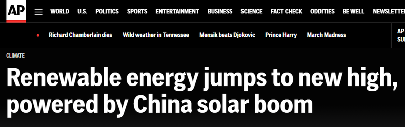 报道称,中国太阳能热潮推动了全球可再生能源发展。数据显示,2024年,中国可再生能源发电新增装机约3.74亿千瓦,其中四分之三来自太阳能发电。