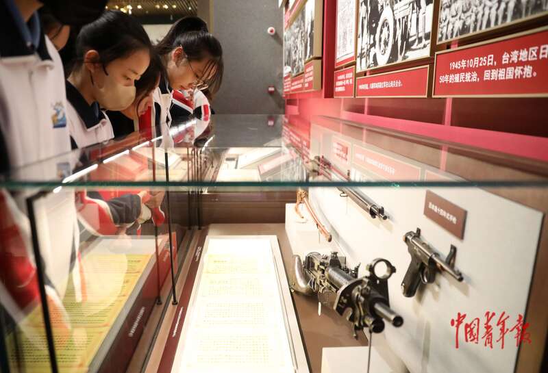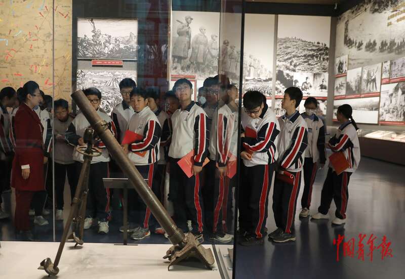 4月3日,北京,中国共产党历史展览馆,“礼赞民族英雄、弘扬抗战精神”教育活动启动仪式结束后,学生们在关于抗日战争的展品前驻足参观。中青报·中青网记者 陈剑/摄