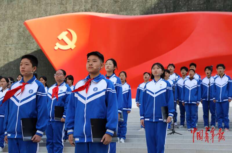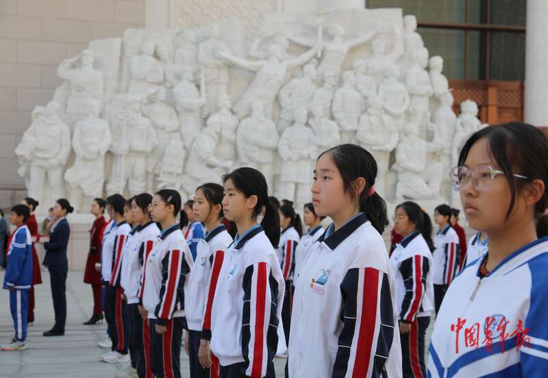 4月3日,北京,中国共产党历史展览馆西广场,参加“礼赞民族英雄、弘扬抗战精神”教育活动启动仪式的学生们。中青报·中青网记者 陈剑/摄