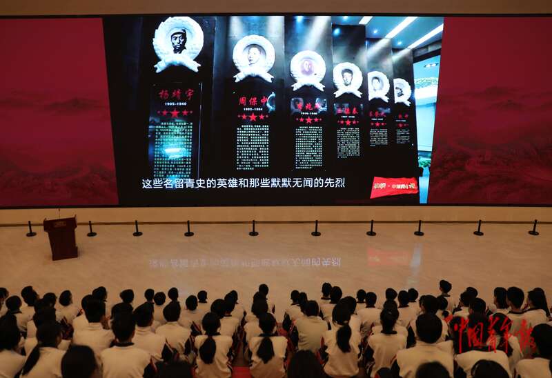 4月3日,北京,中国共产党历史展览馆,“礼赞民族英雄、弘扬抗战精神”教育活动启动仪式结束后,来自北京东直门中学的学生们观看《旗帜·中国青年说——东北抗联》。中青报·中青网记者 陈剑/摄