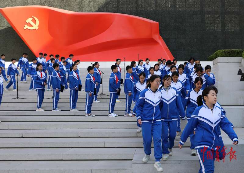 4月3日,北京,中国共产党历史展览馆西广场,“礼赞民族英雄、弘扬抗战精神”教育活动启动仪式结束后,来自北京交大附中的学生代表从台上走下。中青报·中青网记者 陈剑/摄