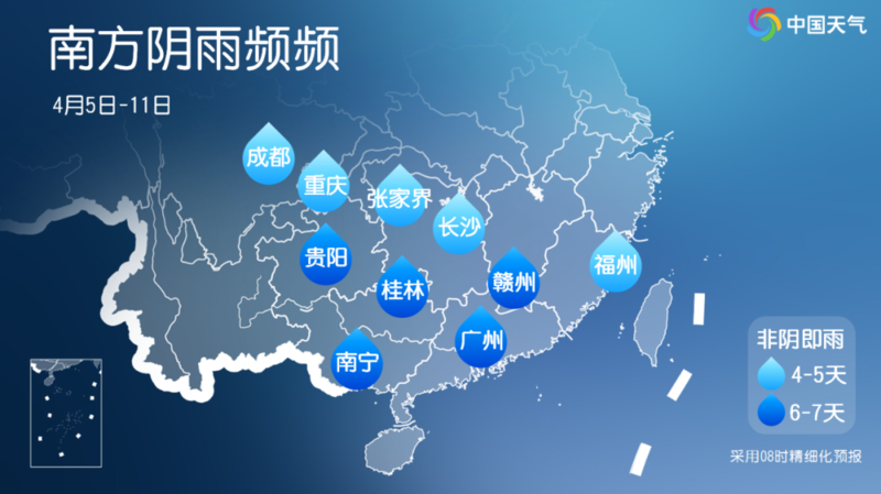 与此同时,南方大部仍沉浸在“清明时节雨纷纷”的氛围感中。