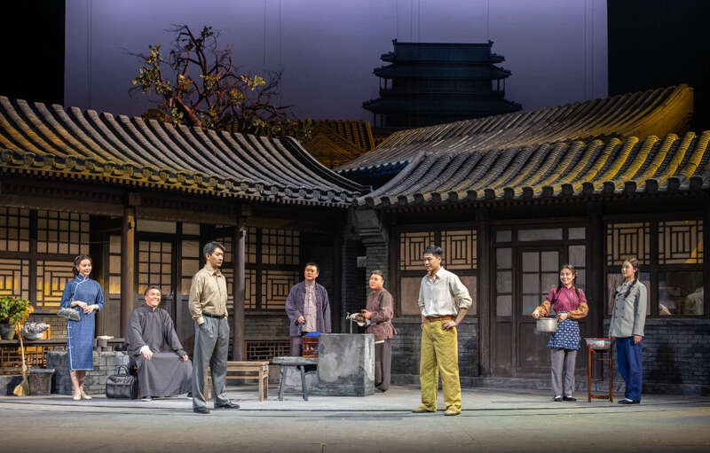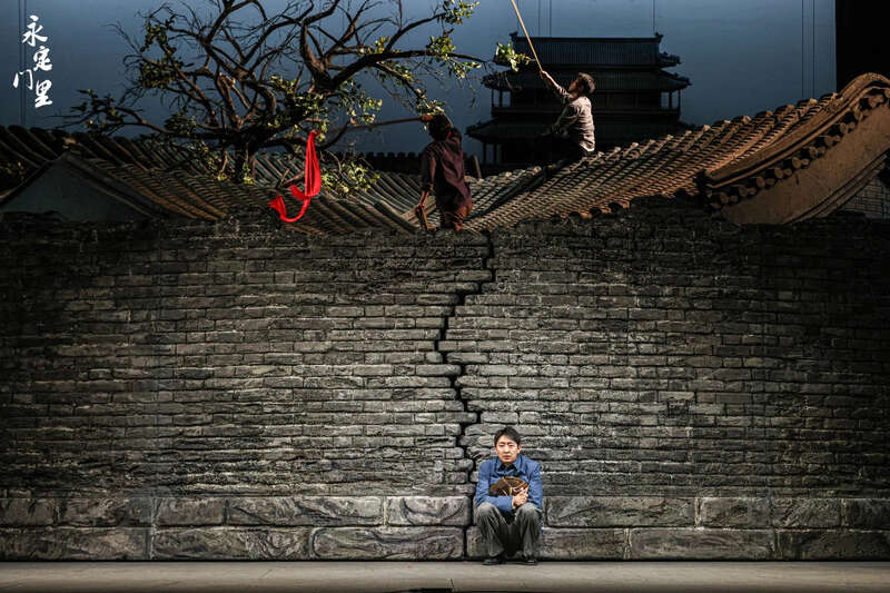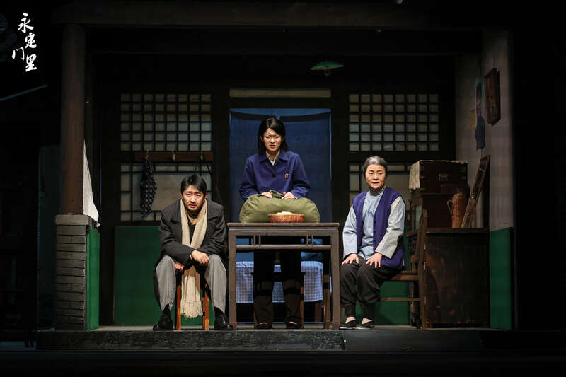 作为北京人艺京味儿话剧的又一力作,《永定门里》在坚守现实主义创作根基的同时,在舞台调度上也实现了新的突破。舞台上,层层四合院与永定门剪影虚实相接,带有时代烙印的服装和道具细节考究,斑驳的城墙与逼仄的胡同构成的双重转台与之交相辉映。既突破了传统京味儿戏胡同四合院的经典设置,又充分体现了京味儿戏的精神内核。在转台徐徐转动间,北京城的时代变迁于方寸间次第展开,呈现出独特的视觉效果。或明或暗的光区切割出不同的时空场景,为演员随时跳出的“心灵独白”创造出虚实转换的表演空间。