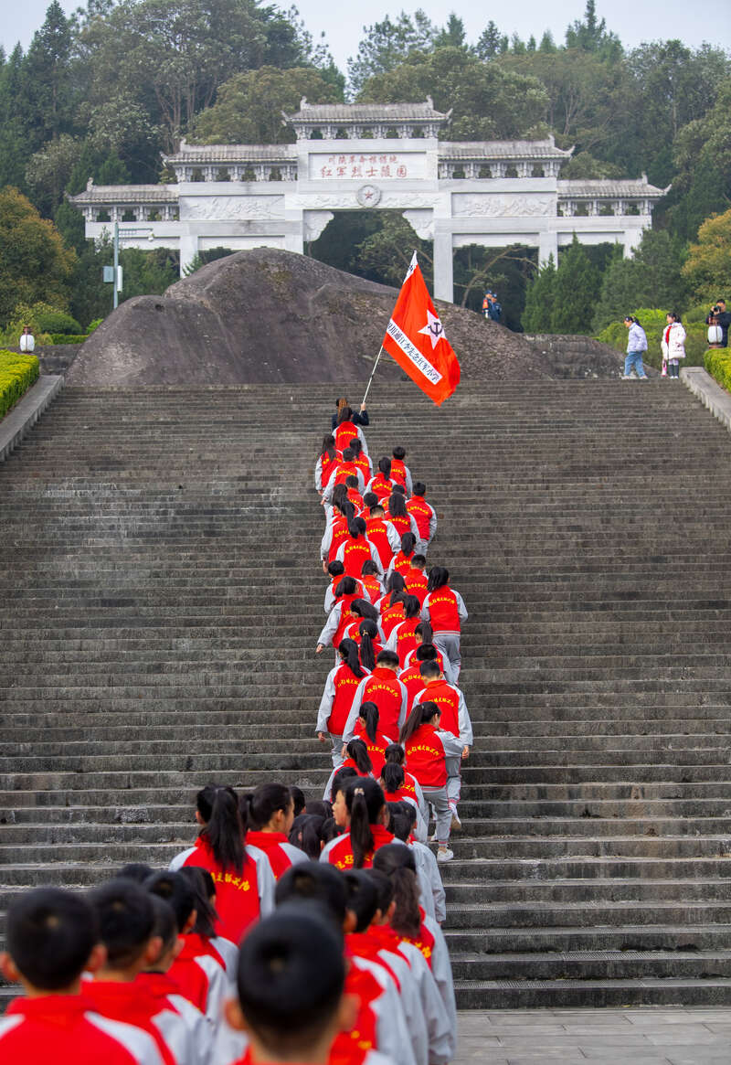 上午9时许,经过1个小时左右的跋涉,沙溪初级中学、李先念红军小学和川陕革命根据地红军小学的师生们安全到达川陕革命根据地红军烈士陵园。陵园依山就势而建,是全国安葬红军烈士最多、规模最大的红军烈士陵园。