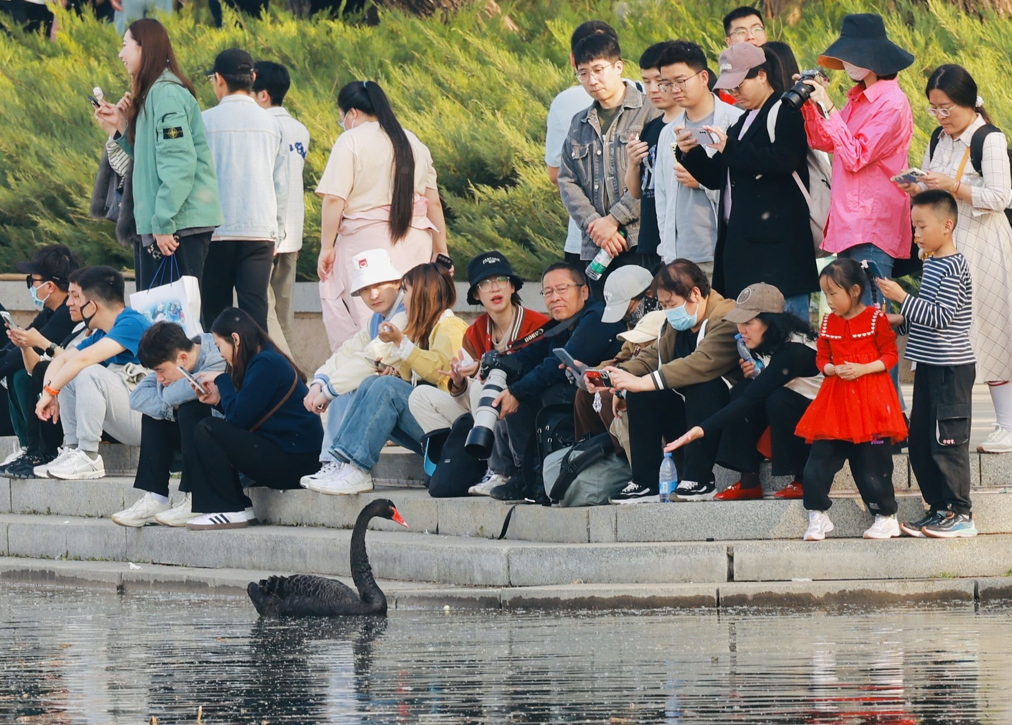 2025年4月6日,北京,玉渊潭公园吸引了大量市民游客前来玉渊潭公园观看“打鸟”景观。一只黑天鹅吸引了游客的目光。